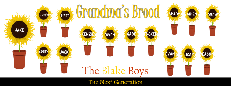 Welcome to Grandma Teri-Lyn’s garden! The Blake matriarch spends a lot of time tending to her gardens, whether they’re the flower variety or one of her brood! These days she has her hands full with the grand-kids Jake, Connor, Colby, Curly, Jack, Mackenzie, Owen, Gabe, Tucker, Brady, Aiden, Drew, Evan, Lucas and Deacon and she wouldn’t have it any other way.