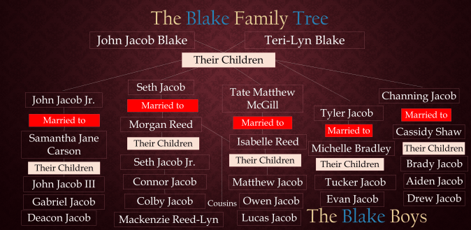 I really like all of the family trees that you have posted; this helps to keep all of the characters and their connections to each other more clear (visual aids are always nice). My question: why did you decide to give every one of the Blake sons and grandsons the patriarch’s middle name (Jacob)?